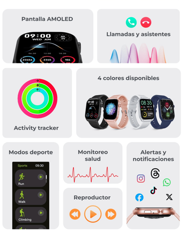 Pantalla del smartwatch: 2.06”, multitáctil. Material: cristal templado.